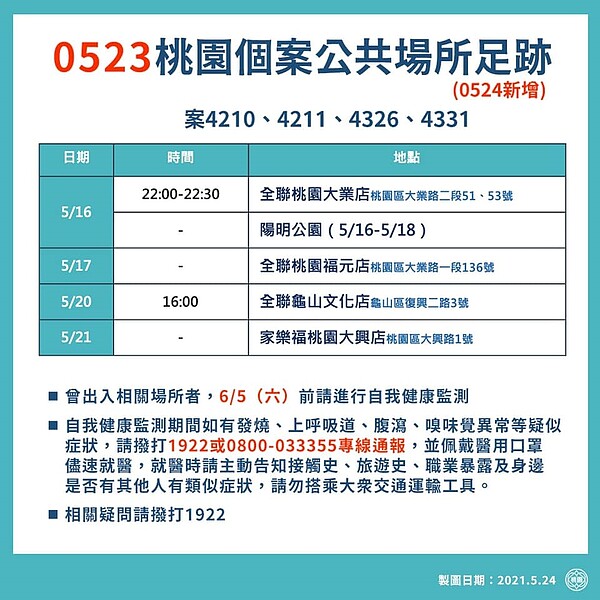 Jun 02, 2021 · 桃園市政府公布0602居家人數統計表。 詹賀舜說,疫調足跡以傳統市場及大賣場居多,包括南崁好市多、大湳市場、員林菜市場、大溪第一公有. Jun 02, 2021 · 桃園公布新足跡。(市府提供) 中央流行疫情指揮中心2日宣布桃園新增28起本土確診案例,疫調出爐的19人全都是親友確診接觸,包含5個家庭,桃園市.
